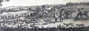 Details from Tillemans’ painting of 1725 showing Evelyn the 2nd Duke of Kingston hunting by Thoresby Lake on which his boats are visible.